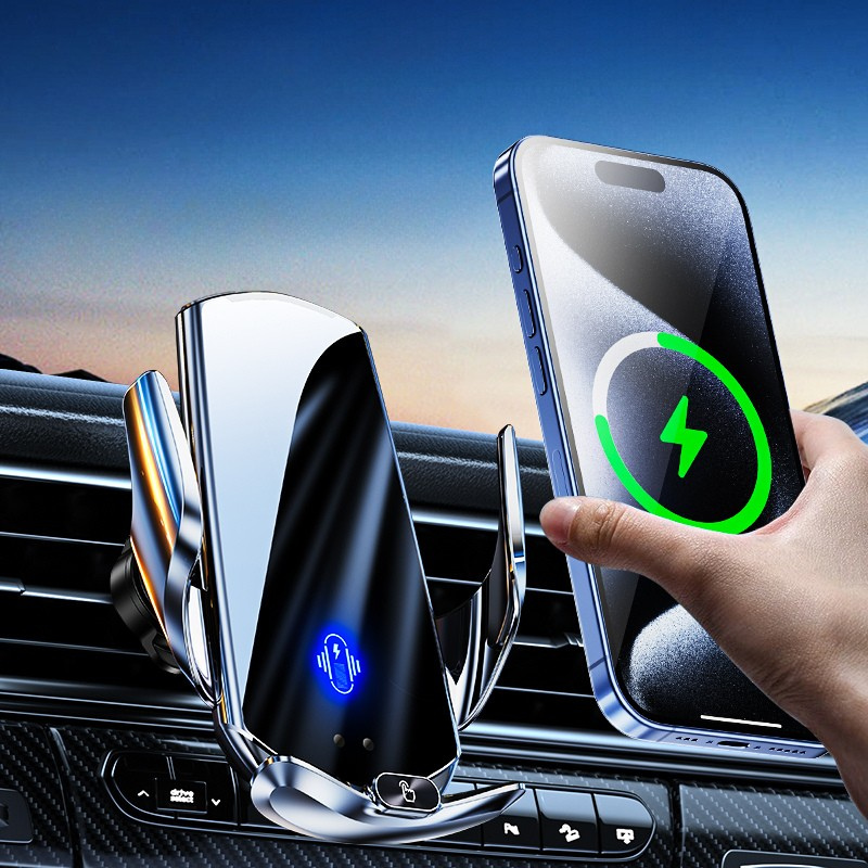 Mobilholder og biloplader i én: En trådløs billader, der kombinerer funktionen som en mobilholder til bilen med en trådløs oplader. En perfekt og sikker løsning, når du bruger mobil GPS-navigation under kørsel! Du klemmer opladeren til ventilationsgitteret.